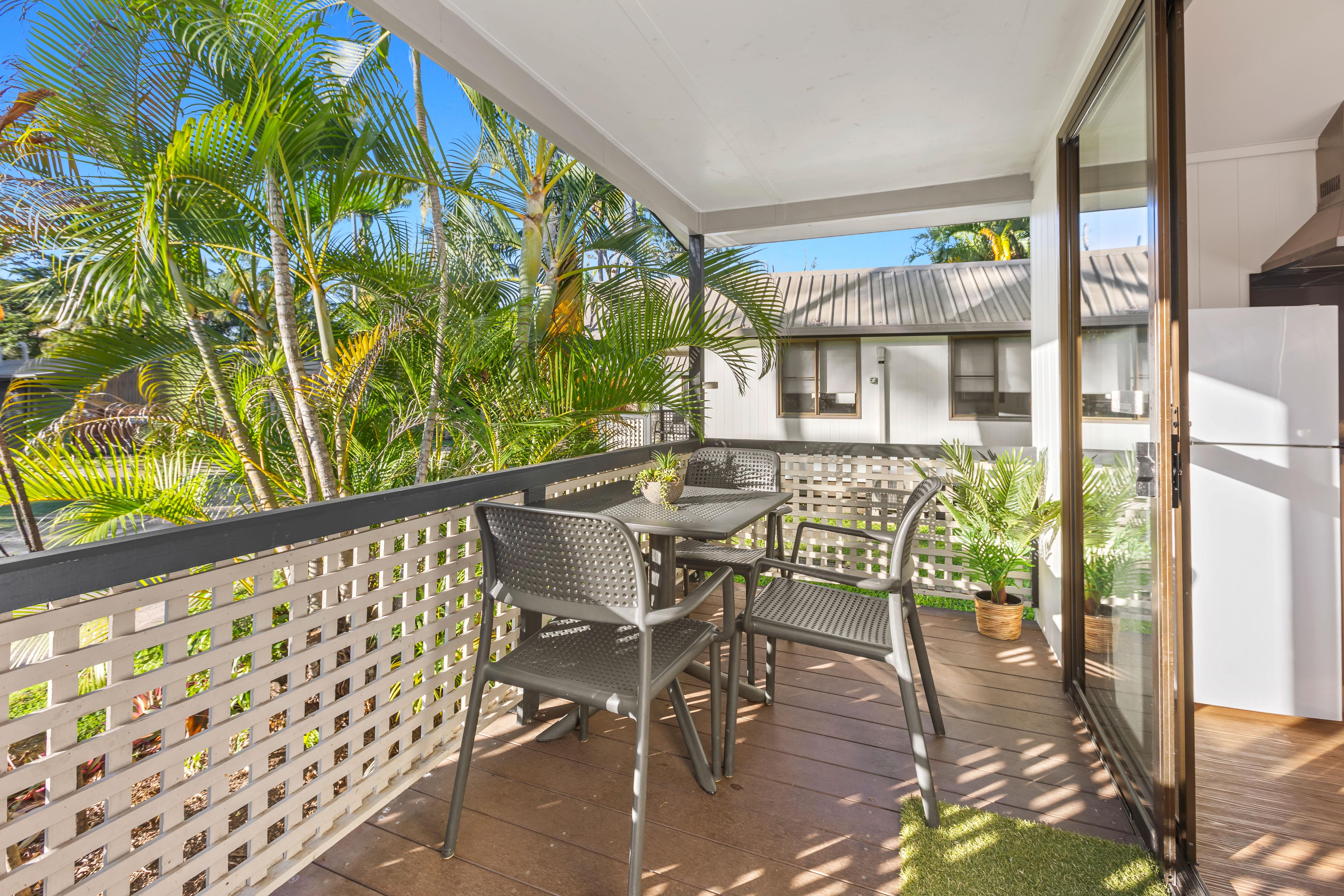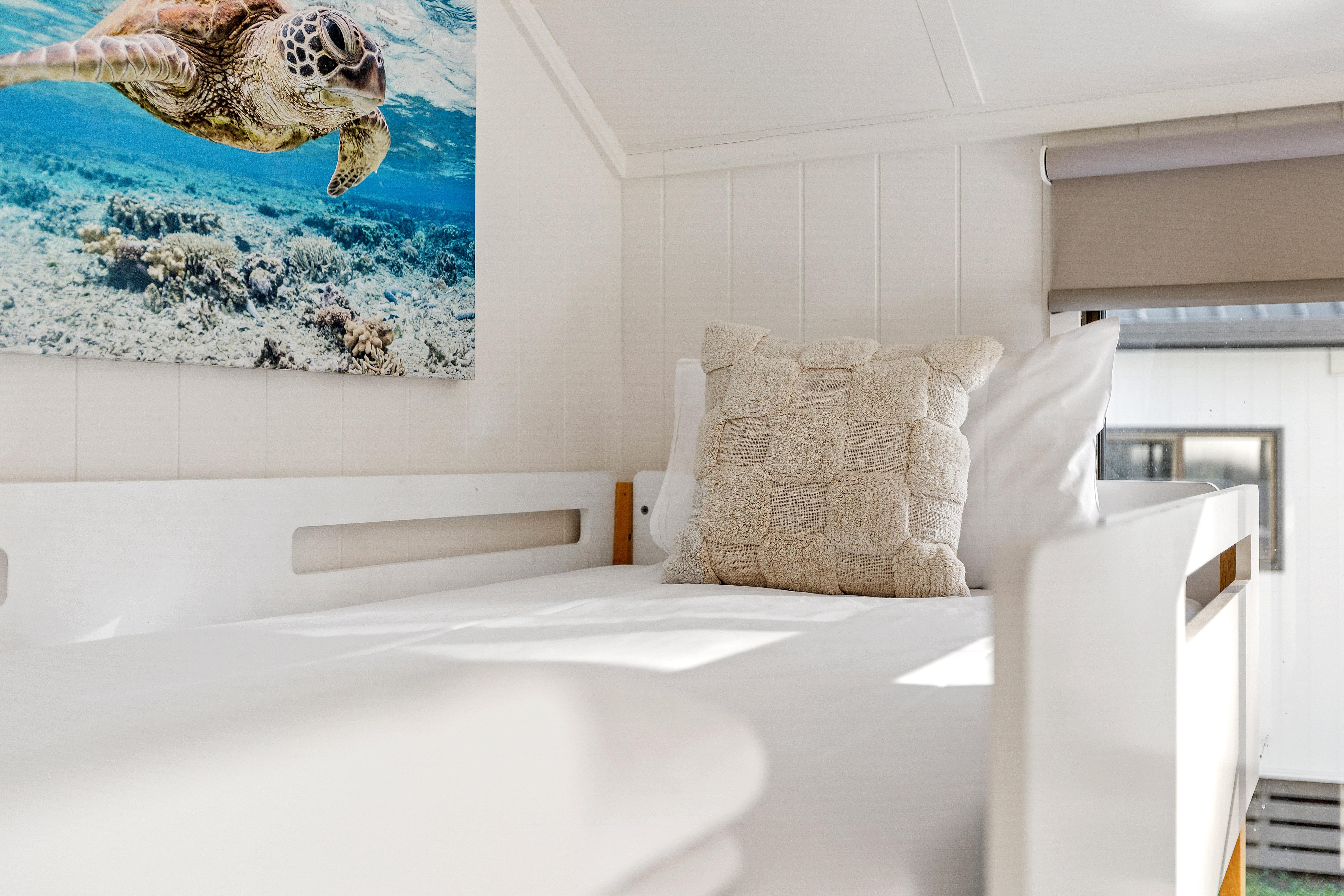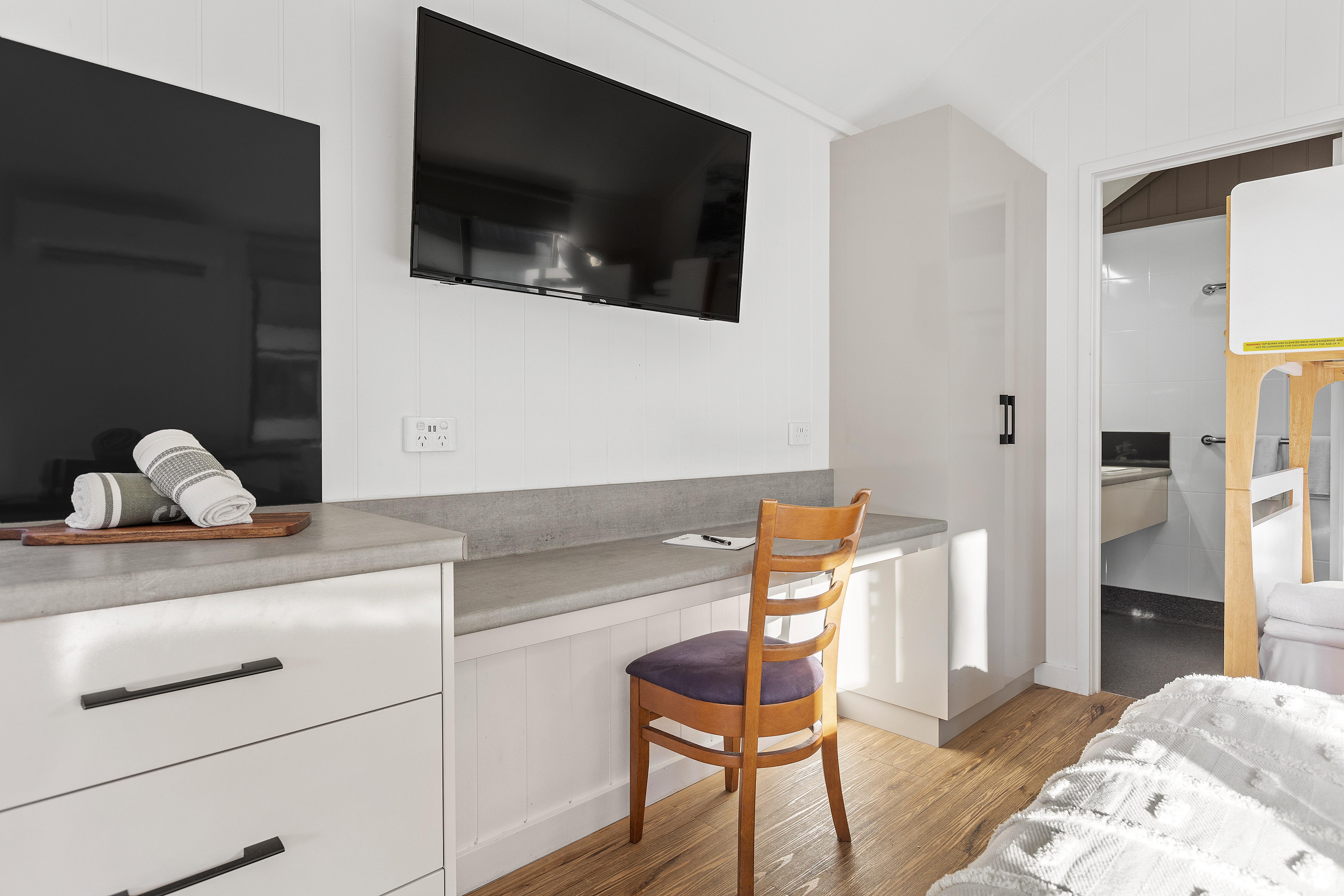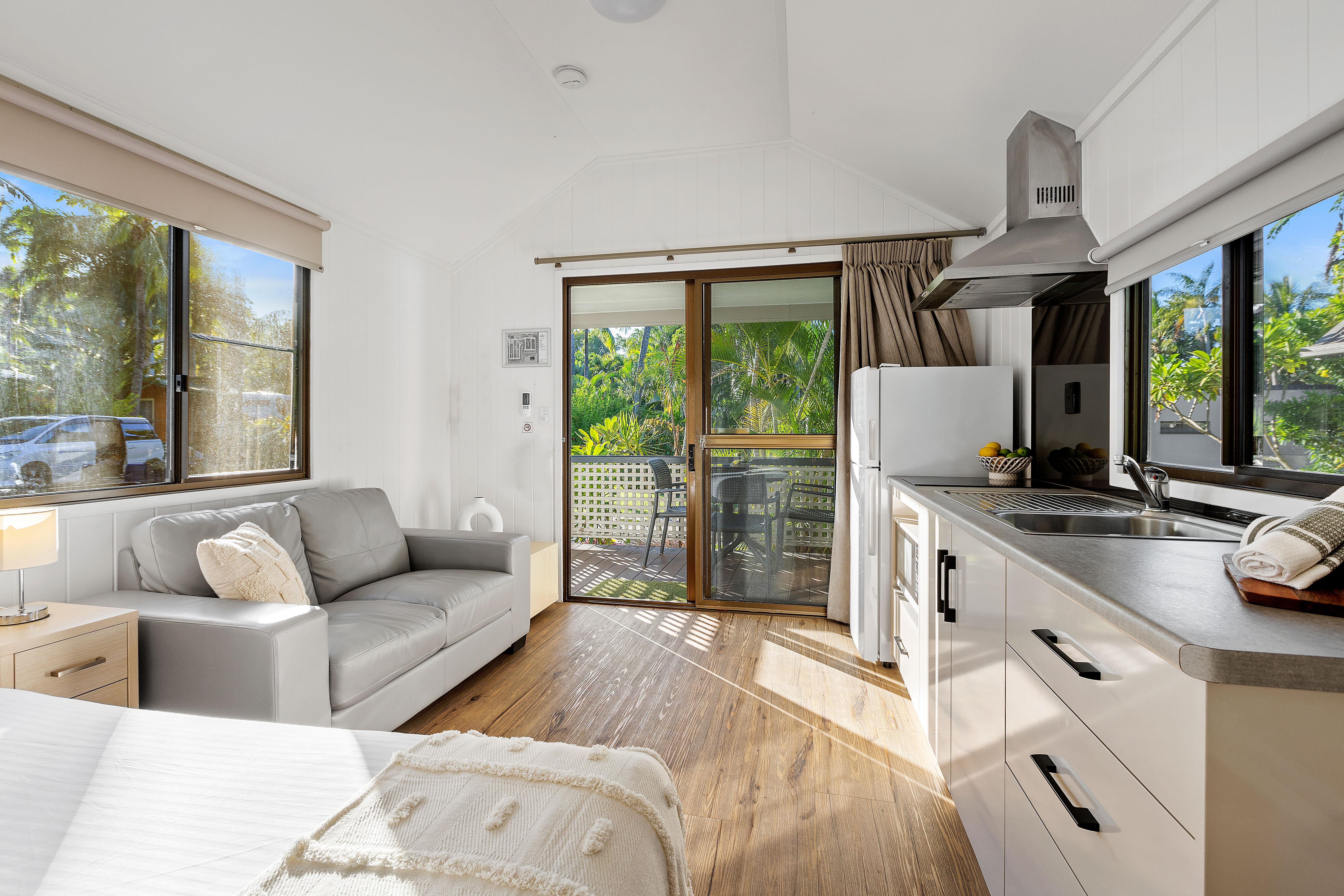 Our Stand Alone Cabin is open plan, with a queen bed and 2 bunks; a well equipped kitchen including a microwave and stovetop; plus a lounge and TV. There is a spacious ensuite with shower and toilet. There is also a balcony with outdoor furniture. It is air conditioned with fans. Linen supplied. Outside is parking for your vehicle. Sorry, no pets.